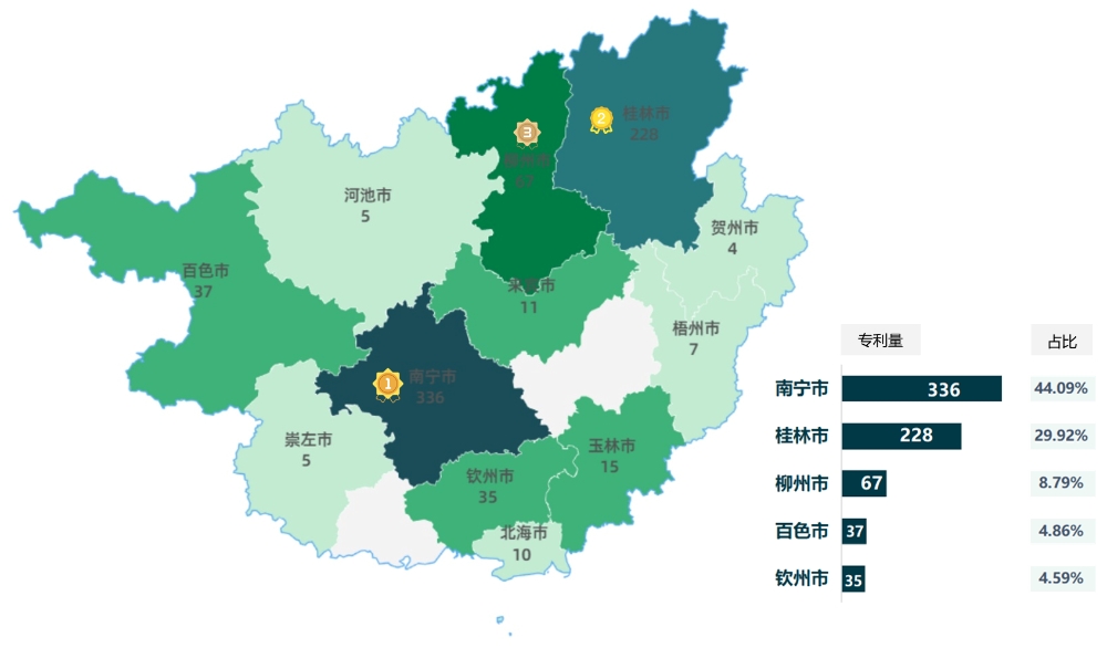从数据中看出,广西“双五星”专利聚集在南宁、桂林、柳州三地,其中,南宁“双五星”专利达336件,占广西“双五星”总量的44.09%;桂林“双五星”228件,占广西“双五星”总量的29.92%;柳州67件,占广西“双五星”总量的8.79%。以上三地“双五星”专利总和为631件,占广西“双五星”总量的82.81%。从产业发展来看,南宁数字经济和服务业、柳州汽车与工程机械、桂林生物医药和电子信息各具优势,三地共集中了全区61%的高新技术百强企业和七成以上战略性新兴产业,形成持续技术迭代需求;从高校院所分布来看,南宁拥有广西大学等“双一流”建设高校,桂林有桂林电子科技大学等高校,柳州亦设广西科技大学,广西70%以上的研究生培养和国家级科研平台布局于此三地。以上因素拉动了三地“双五星”专利产出的整体高位。
