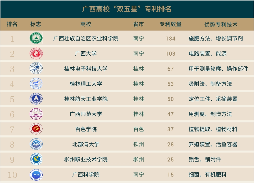 广西高校院所“双五星”专利排名TOP10