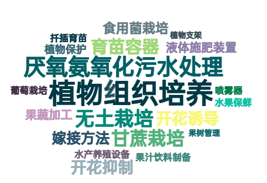 根据专利技术分类号(IPC)统计数据,当前广西“双五星”专利聚集在生物环保、能源电力、数字技术、智慧农业等细分领域。其中,高生物环保领域以C12N(微生物学)、C02F(水处理)为核心,聚焦微生物工程(如厌氧氨氧化、植物组织培养)与循环农业(如无土栽培、食用菌栽培、嫁接/扦插育苗)的交叉创新;能源电力则聚焦在H02J(电能转换)、H01M(电池)技术服务农业系统;“智能喷雾器”“果蔬加工育苗容器”等具体智慧农业技术的频繁出现,体现G06F(数据处理)、H04L(信息传输)技术正从通用算力延伸至农业种植的精准调控环节。以上词频的统计,在一定程度上表明广西“双五星”专利已逐步形成协同生态体系。