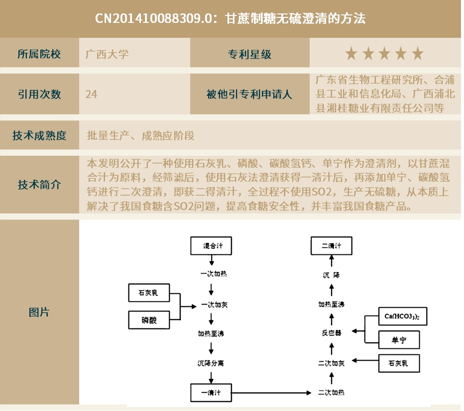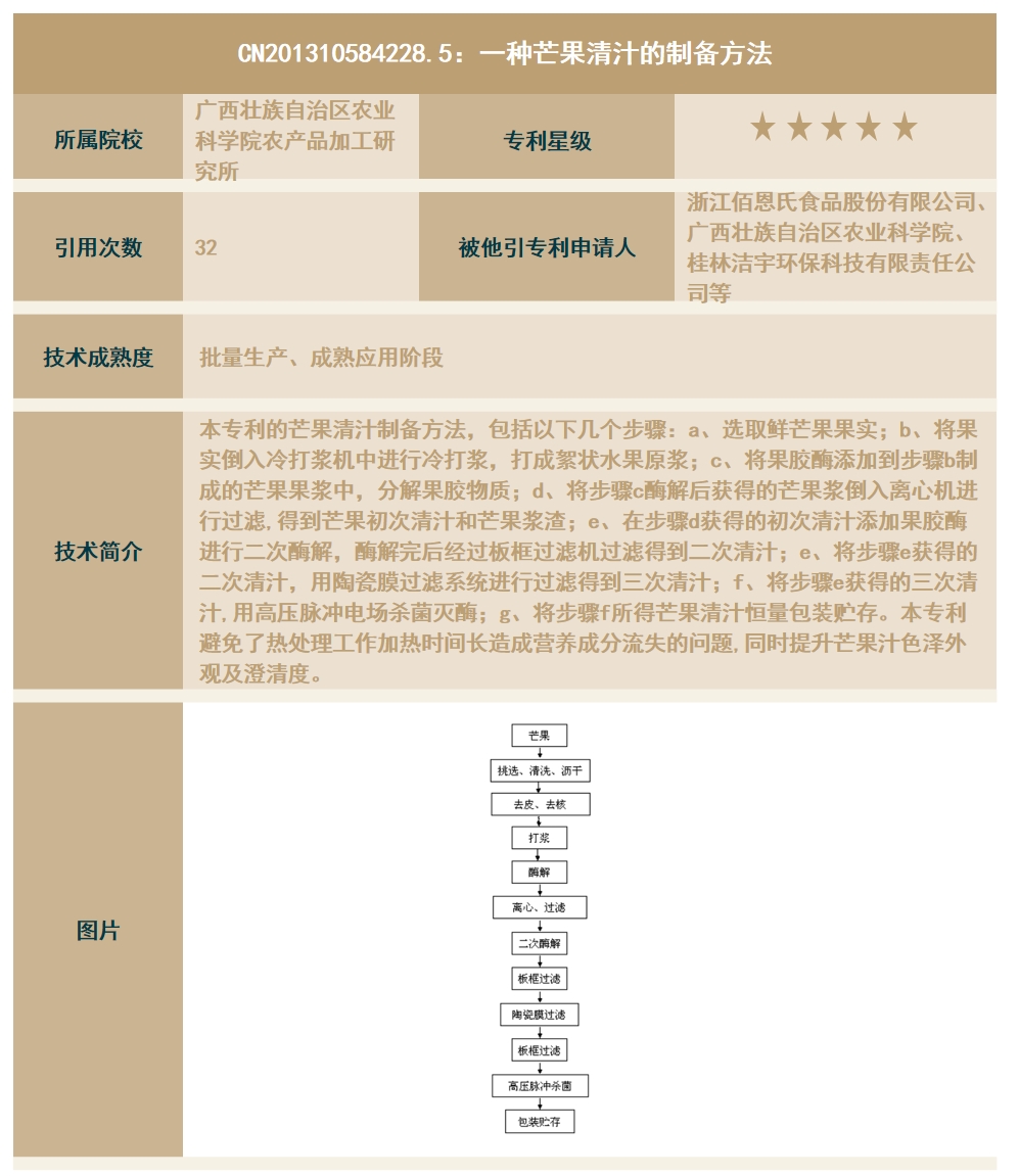从创新主体与成果转化来看,4件高影响力专利以广西大学、百色学院、广西壮族自治区农业科学院农产品加工研究所等高校及科研院所为核心研发力量,通过技术转让、许可、试点应用等多元化方式推动落地,其中,多件专利已成为行业技术标杆,引用率与行业影响力持续提升。
